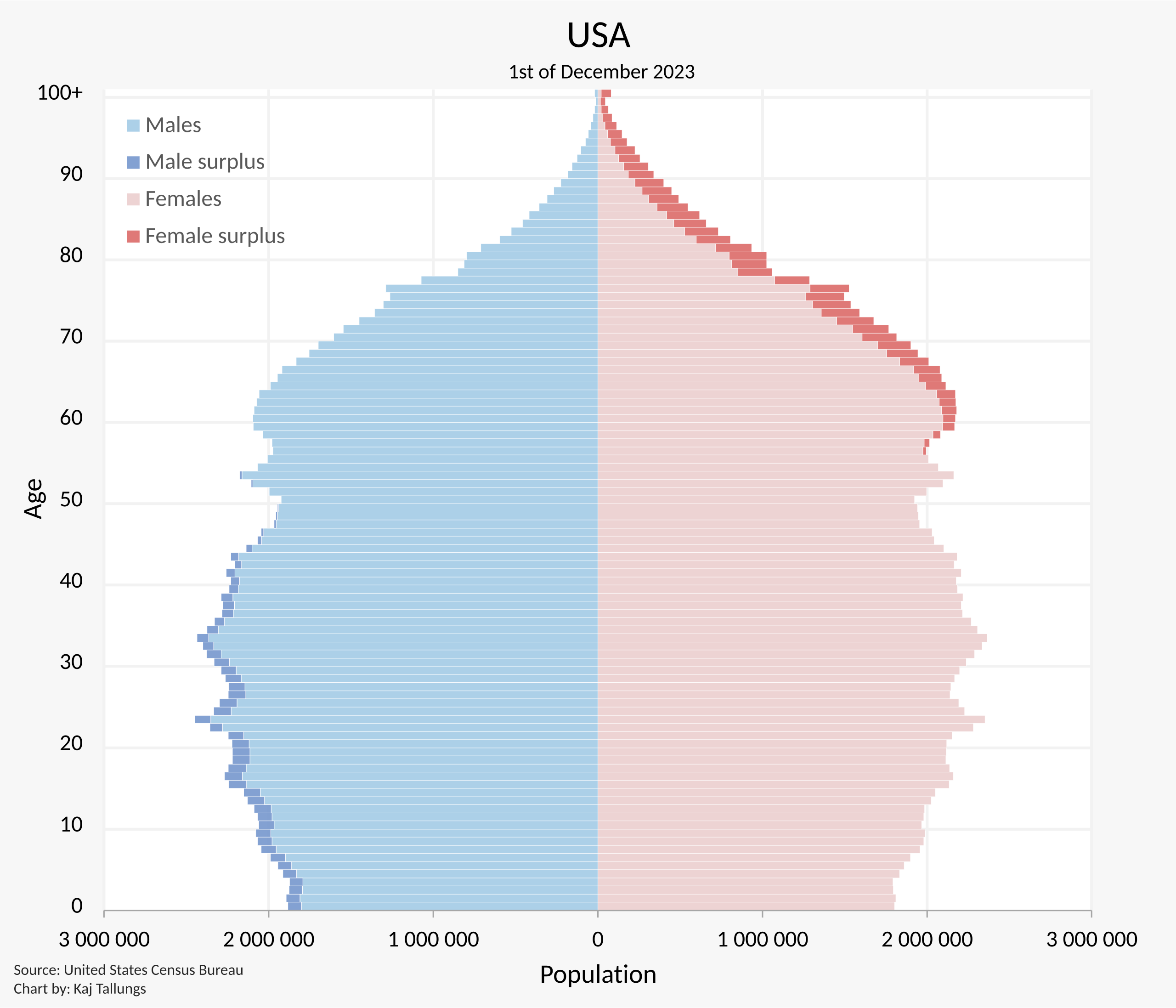 The United States hasn’t inverted yet, but its population pyramid is now more rectangular. We have already seen a decline in manufacturing throughout the US, and it’s not clear that policy or financial incentives can bring it back quickly, as the TSMC experience in Arizona demonstrates.