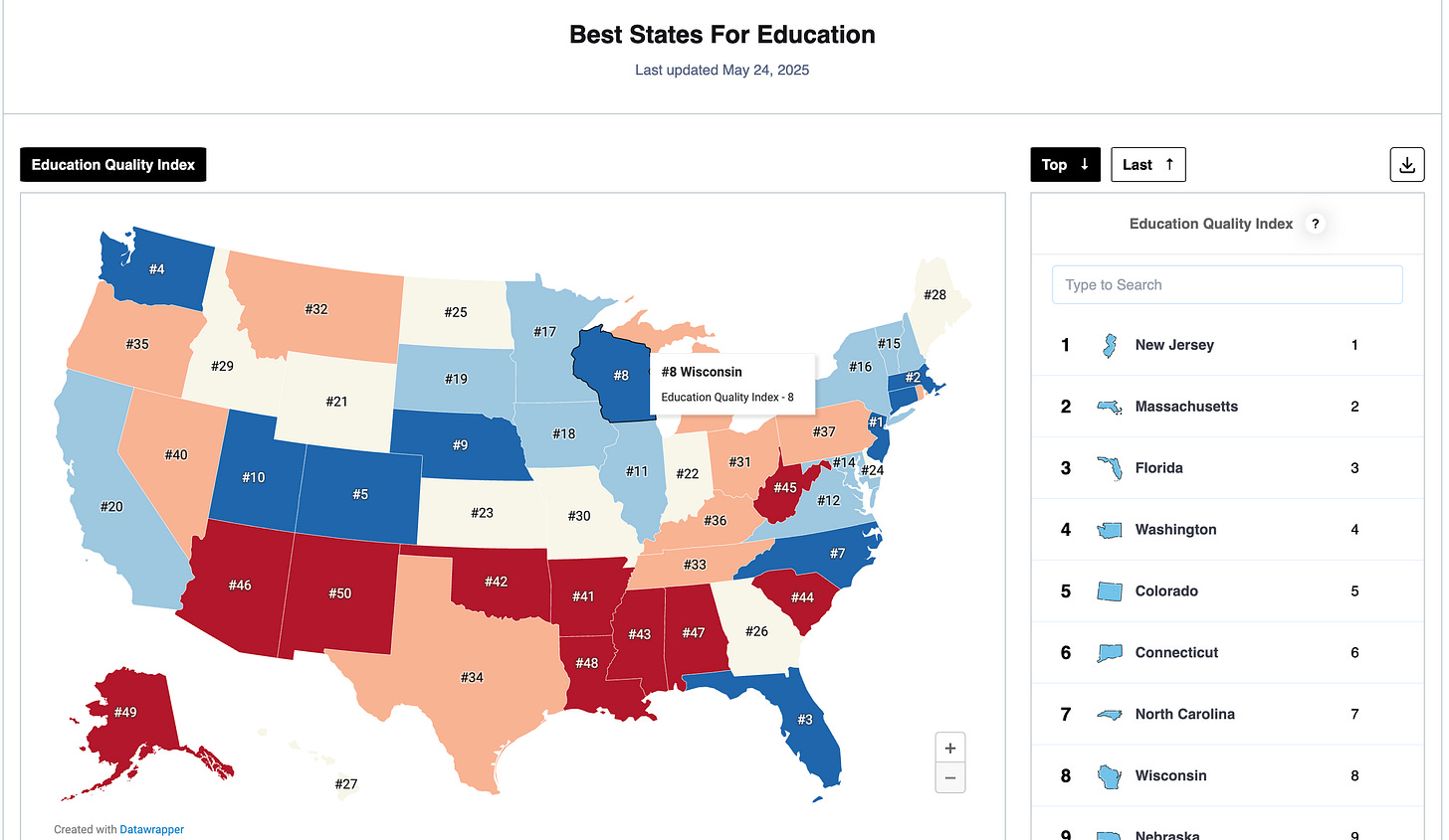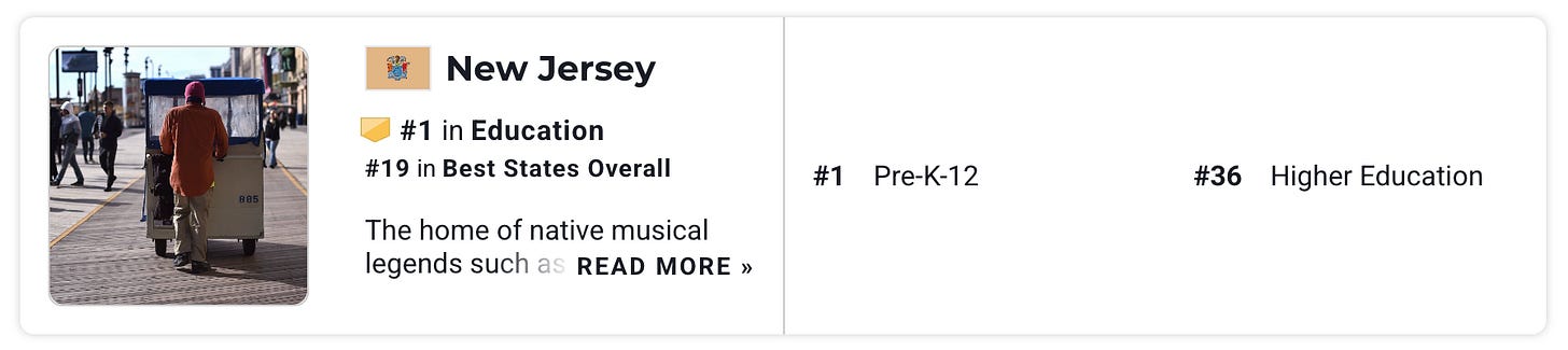 But most importantly, New Jersey remains one of the best places in the entire country to get an education. The state consistently ranks at or near the top in many educational rankings. US News & World Report ranks it number one in the nation. Another website (datapadas.org), which gathers data from various sources, also ranks New Jersey number one, followed by Massachusetts and then Florida.