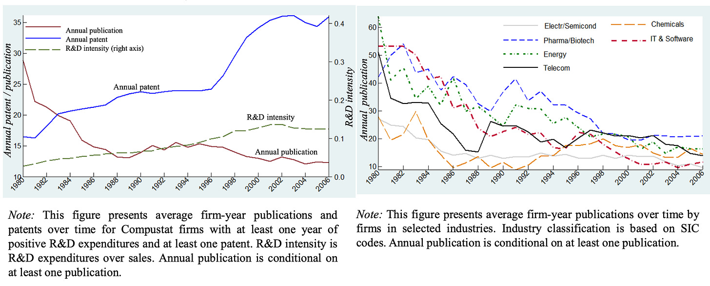 My colleagues Ashish Arora, Sharon Belenzon, and their co-author Andrea Patacconi document that starting about the same time Gordon identifies as the end of the special century, from 1870 to 1970, you began to see a pretty drastic decline in the production of basic academic publications by corporations. I've discussed this before in a different post, but the decline of science in corporations was a pretty significant moment in the history of innovation.