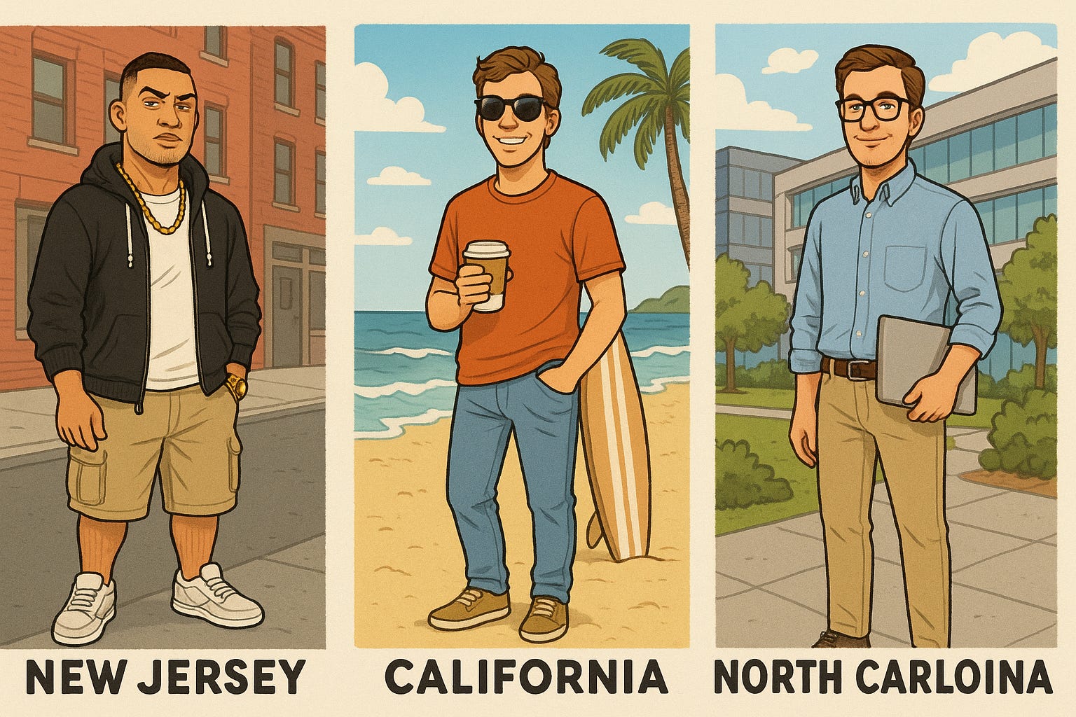 If you think these are just my stereotypes, here's a ChatGPT-generated image with a simple prompt: "Generate an image of what you believe the typical person from New Jersey, California, and the Research Triangle Park in North Carolina looks like."